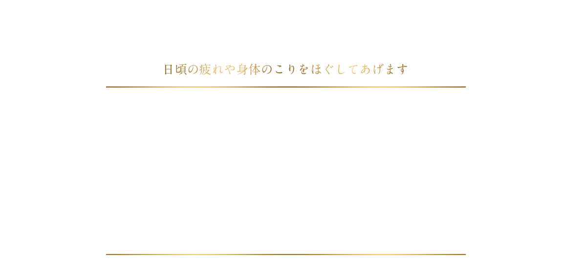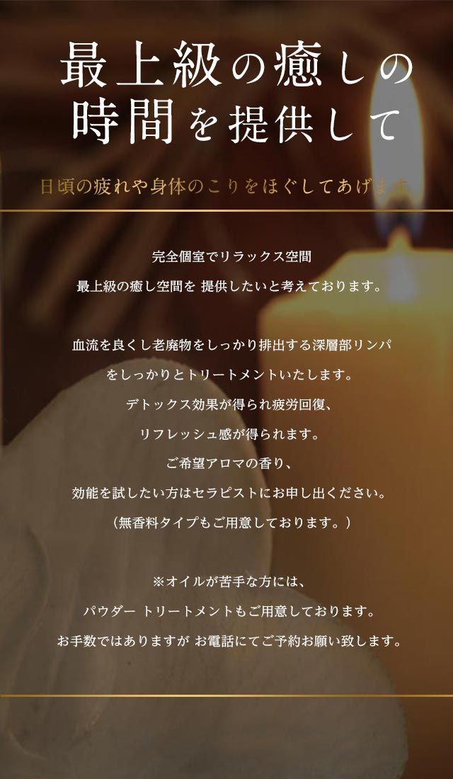 連日のお問い合わせありがとうございます。お忙しい皆様に満足して頂けるように皆様の隠れ家になれるように日々努力していきます。当店では徹底した研修と人選によっておもてなしのサービスを心掛けております。当店自慢のセラピストによる心和む施術をご堪能ください。必ずご満足頂けると確信しております。